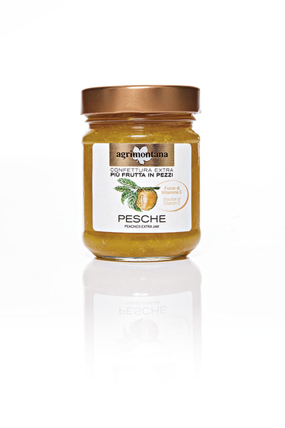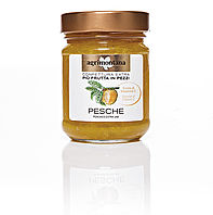 Confettura extra di Pesche con più frutta in pezziFonte di vitamina C la cottura a basse temperature preserva intatte le proprietà della frutta e il naturale contenuto vitaminico.