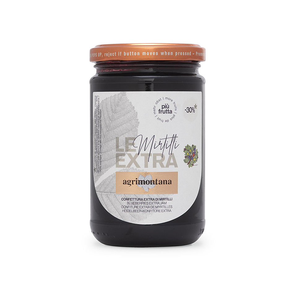 Confettura le Extra - Mirtilli selvaticiCon meno zucchero rispetto alla ricetta classica Agrimontana. Composte da frutta e zucchero di canna, le confetture extra sono naturalmente prive di glutine.