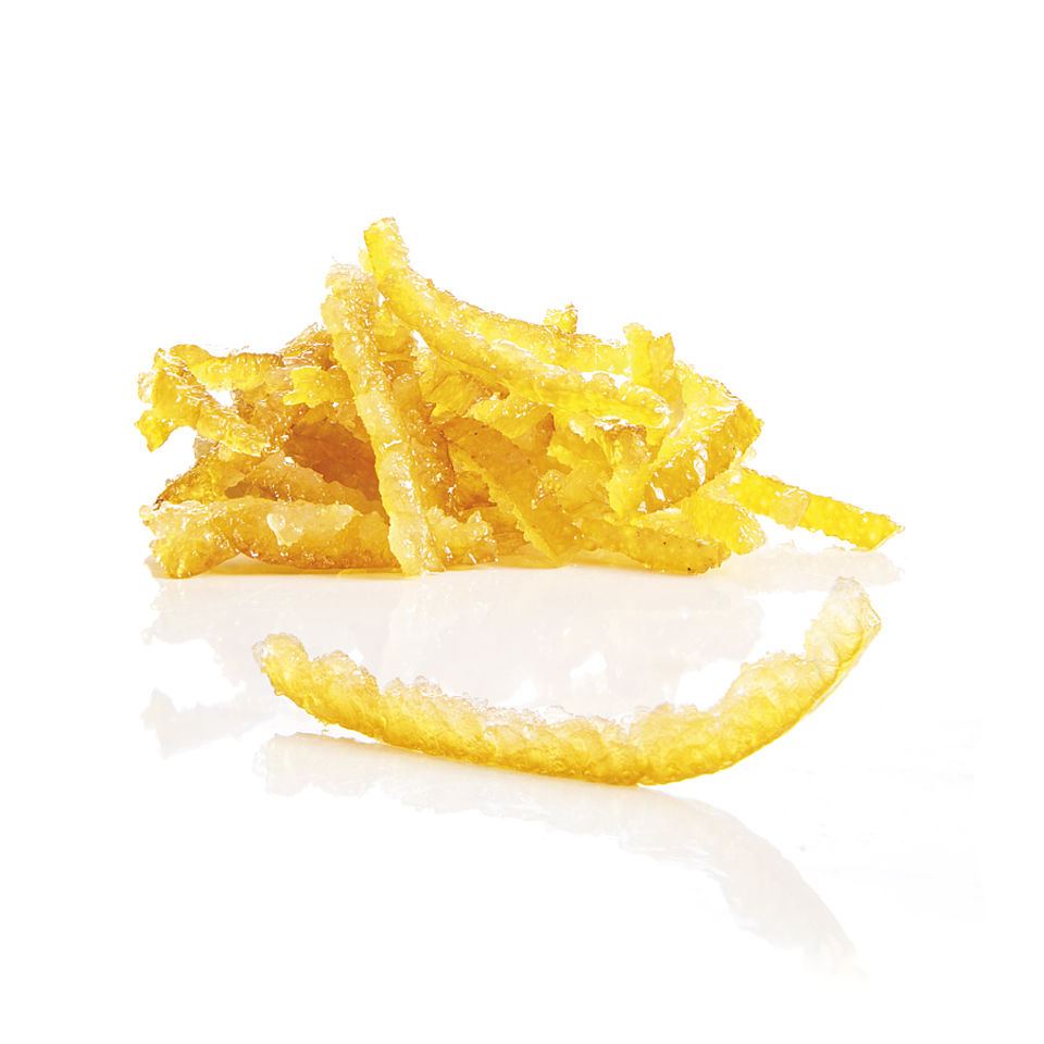 Scorza di mandarino a filettiMandarini delle varietà Avana Apirene, Rosso e Clemenville accuratamente selezionati e tagliati a mano per non rovinare la buccia sottile dell’agrume. Ne risulta un filetto sottile e irregolare, che conserva le caratteristiche organolettiche del frutto. Origine: Calabria, Sicilia, Murcia (Spagna).