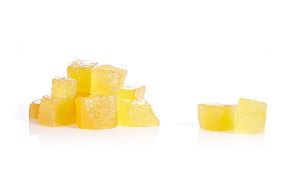 Zenzero a cubettiLa canditura molto delicata permette di mantenere il colore chiaro dello zenzero e una spiccata aromaticità. Origine: Manciuria e Shandong (baia di Bohai).